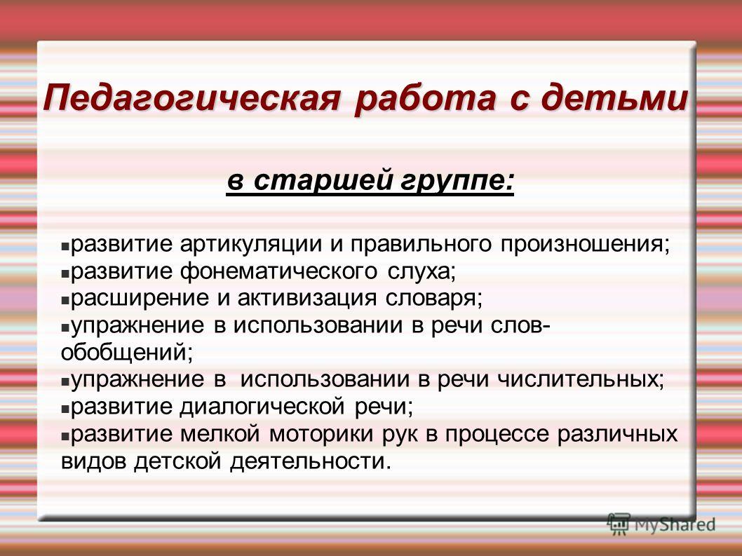 в старшей группе: развитие артикуляции и правильного произношения; развитие фонематического слуха; расширение и активизация словаря; упражнение в использовании в речи слов- обобщений; упражнение в использовании в речи числительных; развитие диалогической речи; развитие мелкой моторики рук в процессе различных видов детской деятельности.
