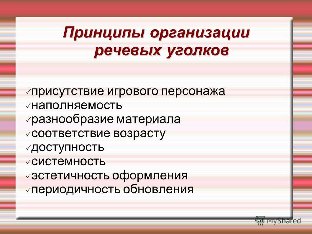Принципы организации речевых уголков присутствие игрового персонажа наполняемость разнообразие материала соответствие возрасту доступность системность эстетичность оформления периодичность обновления