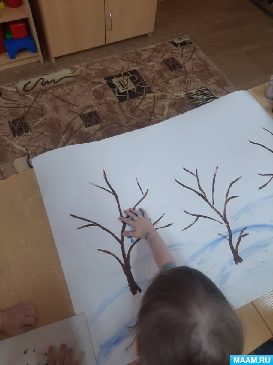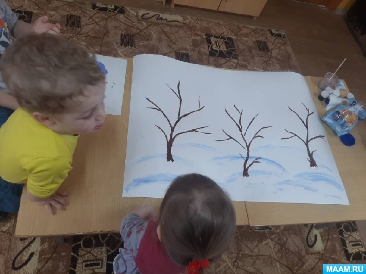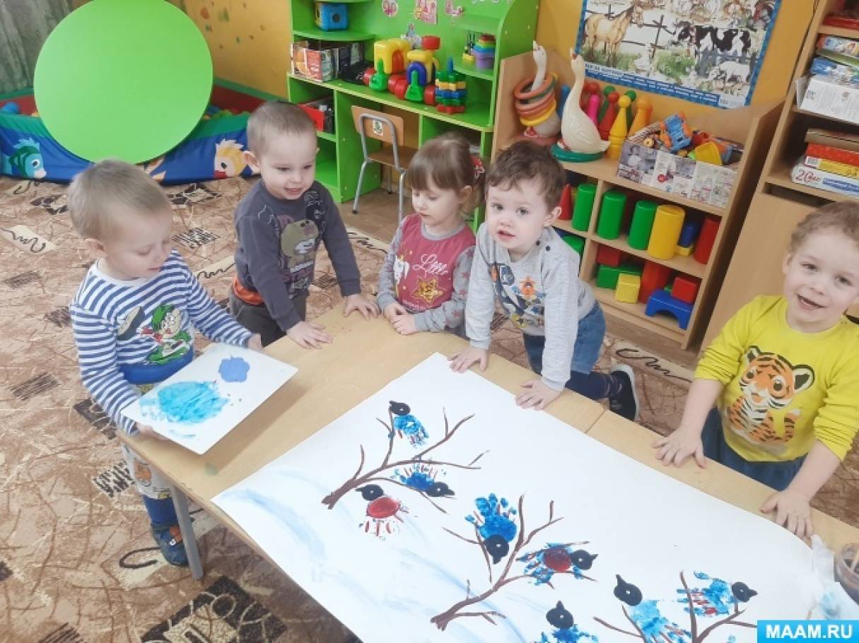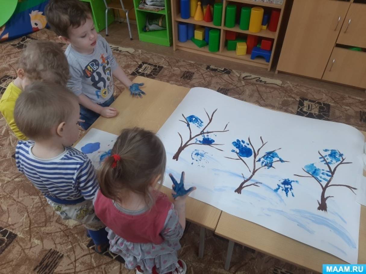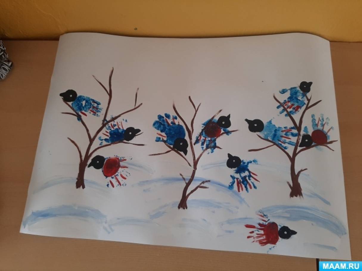— Верно. На моем листе какая-то не правильная весна. Снег тает, а где же птички? Давайте их и нарисуем. Для этого нужно обмакнуть ладошку в краску и приложить ее к листу. Из ладошки получится туловище и хвост. Голову мы дорисуем гуашью.