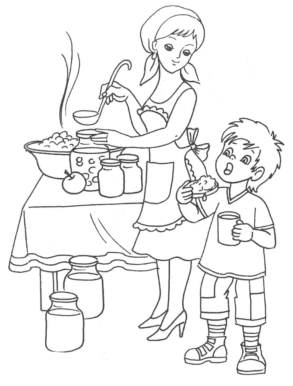Мама – это бесконечное домашнее хозяйство. Нужно приготовить, накормить, убрать, проверить, постирать и еще много-много чего. Поэтому рисунки мамы и ребенка в большинстве своем выглядят похоже: