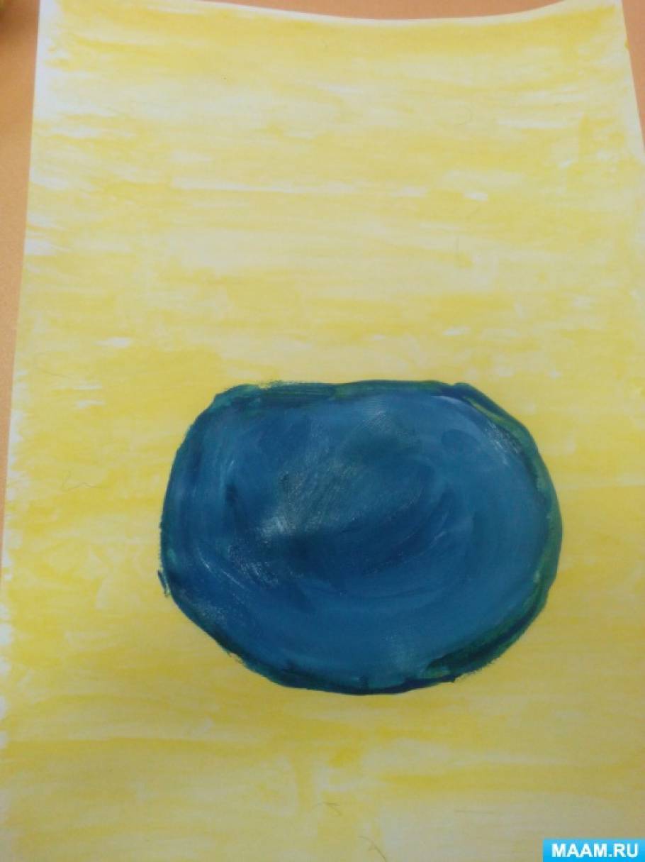 10. Бумажный комочек обмакиваем в желтый цвет и в уголке рисунка у нас засияло восходящее солнышко, его лучики разливаются по полянке.
