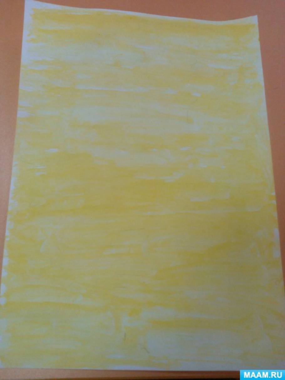 1. Шаг. Тонируем лист бумаги в любой цвет (я выбрала желтый)с помощью краски и кисти.
