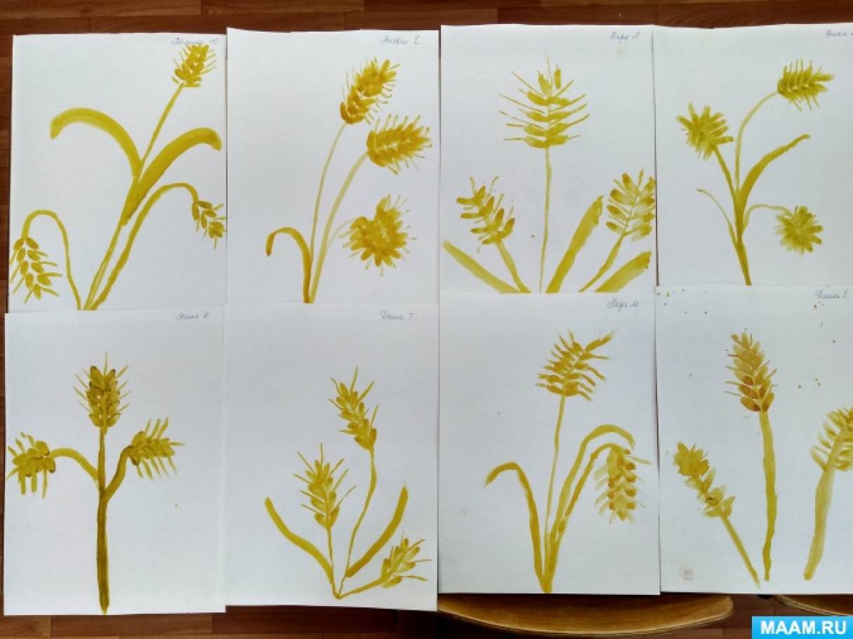 Цель:расширить знания детей о колоске, учить рисовать колосок гуашевой краской, передавая особенности его строения, закрепить навыки рисования с помощью примакивания ворса кисточки, воспитывать художественный вкус, воспитывать желание помогать другим. Воспитывать бережное отношение к хлебу и к труду людей, которые делают хлеб.