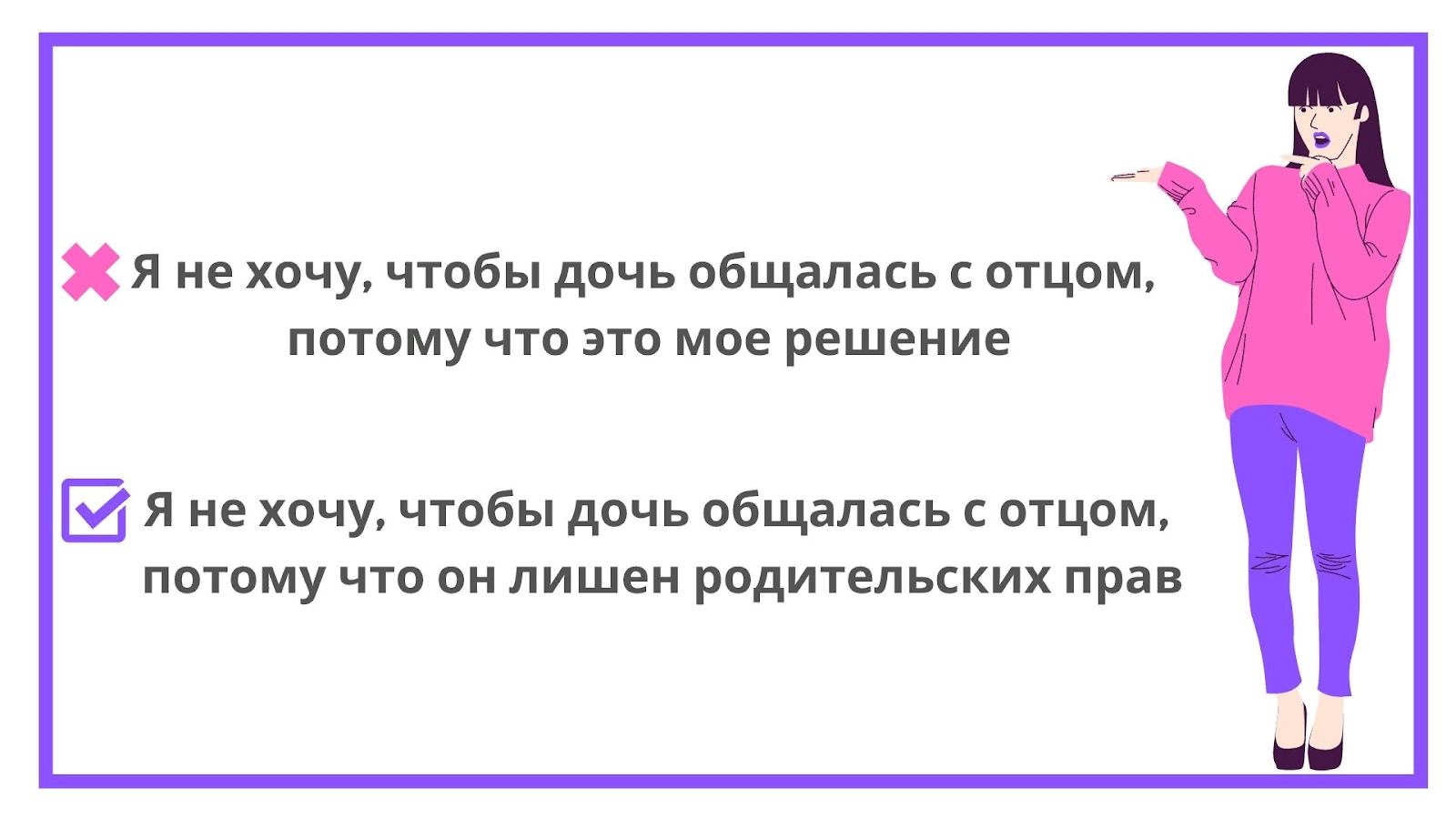 Но даже если отец подвергает опасности жизнь и здоровье ребенка, мать не может запретить им общаться сама. Зато она может обратиться в суд для лишения его родительских прав. В этом случае она сможет ограничить их общение совершенно законно.
