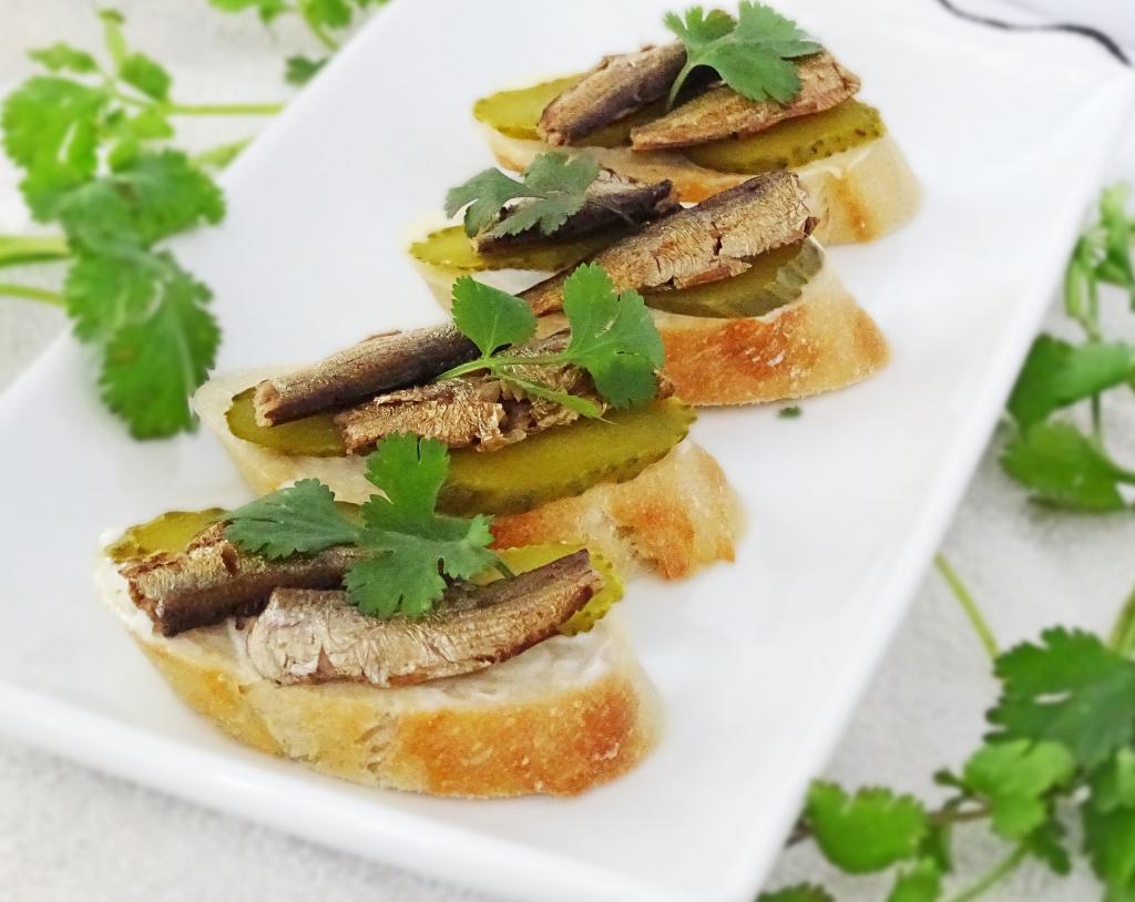 Пользуются спросом и бутерброды со шпротами. Основа, опять же, любая, порезанная на тонкие ломтики. Нарежьте тонкими слайсами помидоры и соленые огурцы. Смажьте майонезом хлеб и выложите на него овощи. Затем выложите шпроты, с которых стек весь жир. Сверху каждый бутерброд украсьте листьями петрушки или кинзы. Саму тарелку можно декорировать листьями салата.