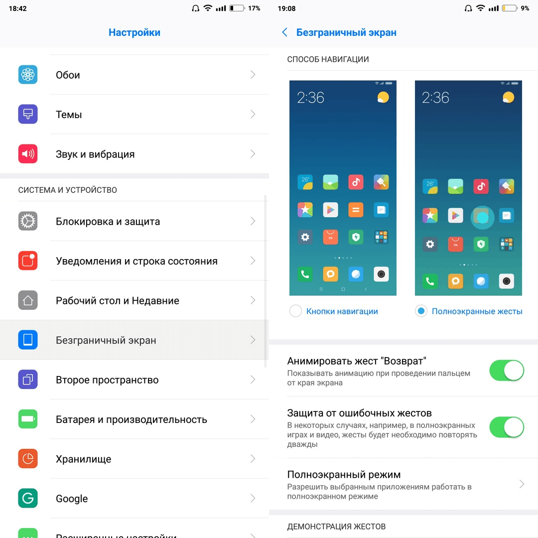 На смартфонах от компании Xiaomi (сяоми) стоит включить навигацию с помощью жестов. Для этого зайдите в настройки и найдите пункт «безграничный экран». Благодаря этому у вас пропадут кнопки внизу экрана и вы сможете использовать 100% экрана. Особенно полезно это будет для смартфонов с разрешением 18:9, так как используя весь экран вы сможете наслаждаться качественным просмотром видео.