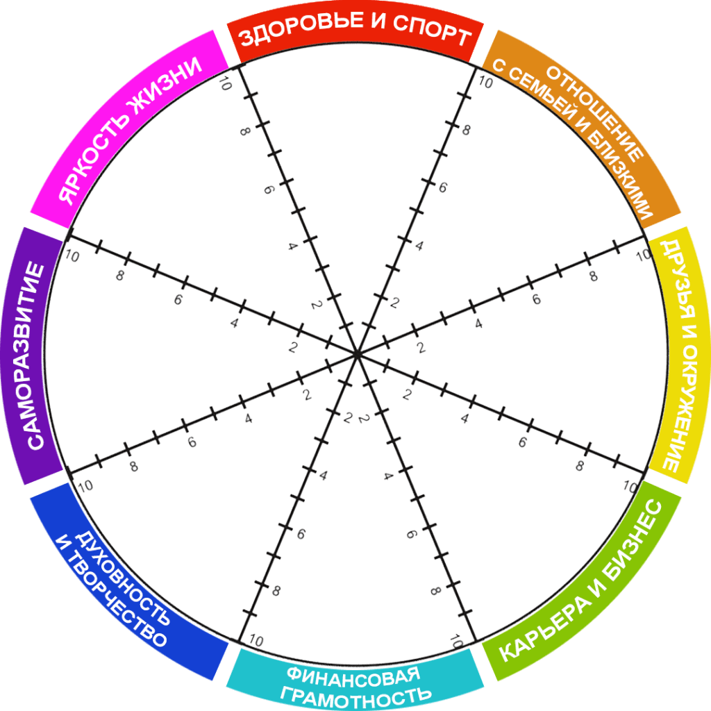 Психологи выделяют восемь основных областей жизни наиболее важных для большинства людей. Их удобно изобразить в виде круга, разделенного на секторы. Каждый сектор выделен под одну основную жизненную область.