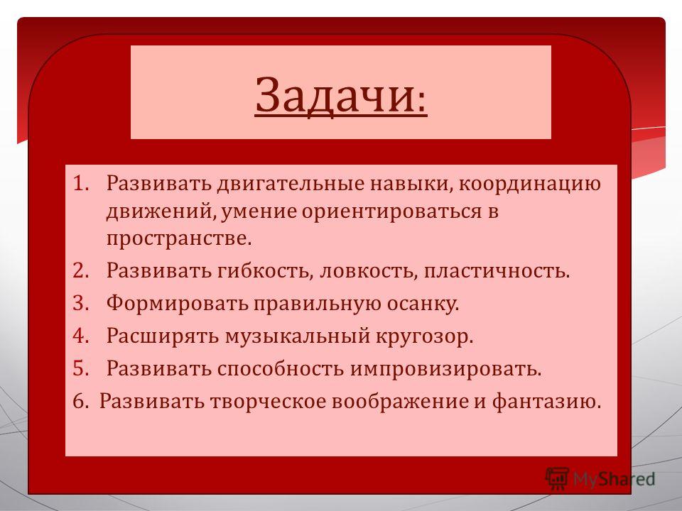 1.Развивать двигательные навыки, координацию движений, умение ориентироваться в пространстве. 2.Развивать гибкость, ловкость, пластичность. 3.Формировать правильную осанку. 4.Расширять музыкальный кругозор. 5.Развивать способность импровизировать. 6. Развивать творческое воображение и фантазию. Задачи :