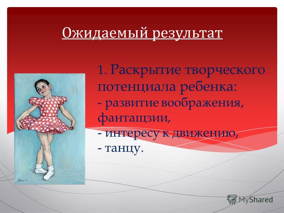 1. Раскрытие творческого потенциала ребенка: – развитие воображения, фантащзии, – интересу к движению, – танцу. Ожидаемый результат