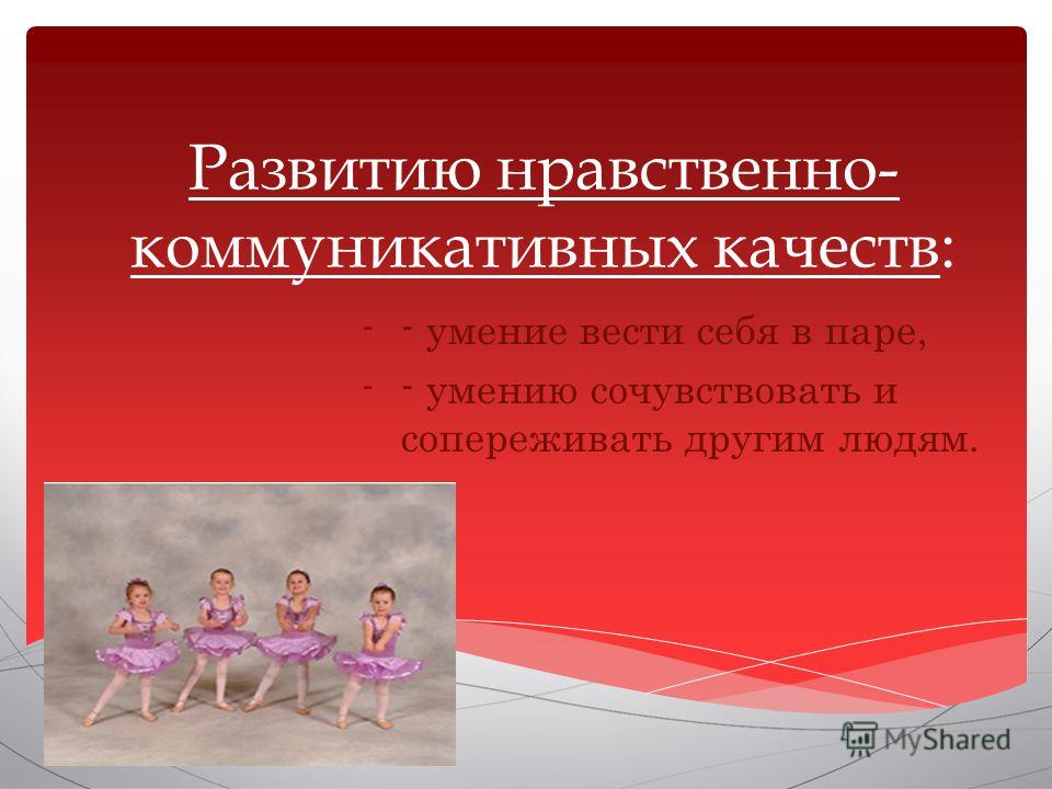 Развитию нравственно- коммуникативных качеств: — умение вести себя в паре, — умению сочувствовать и сопереживать другим людям.