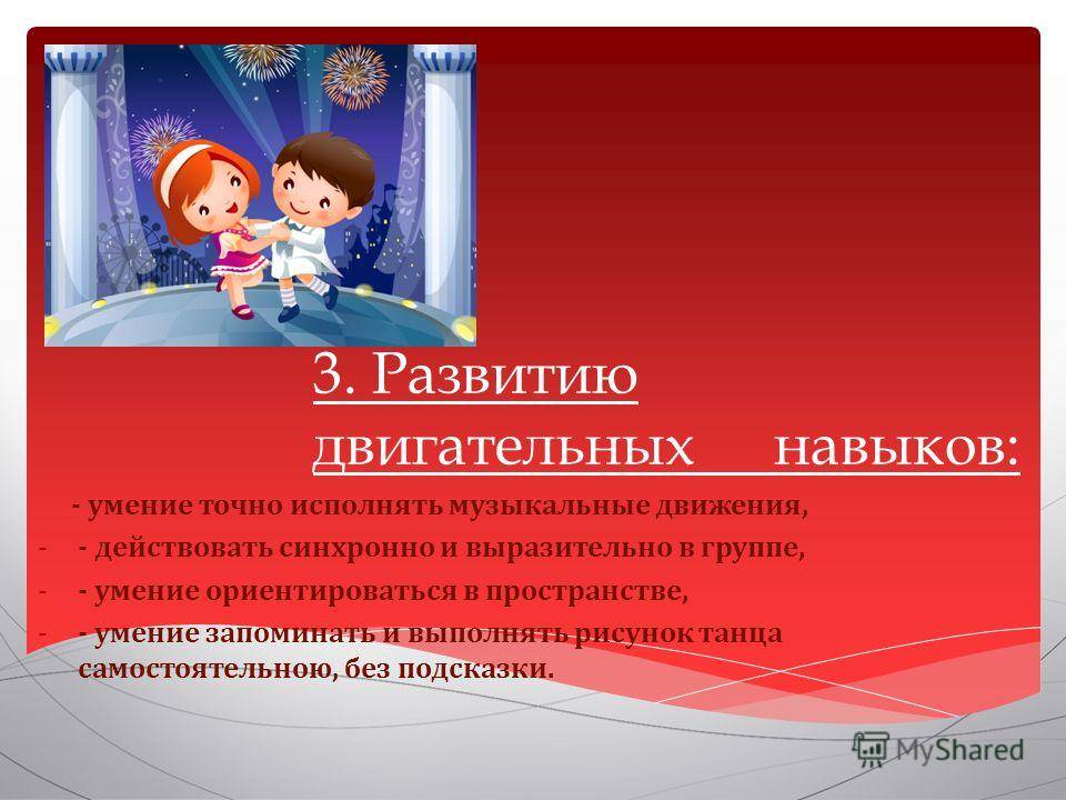 3. Развитию двигательных навыков: – умение точно исполнять музыкальные движения, — действовать синхронно и выразительно в группе, — умение ориентироваться в пространстве, — умение запоминать и выполнять рисунок танца самостоятельною, без подсказки.