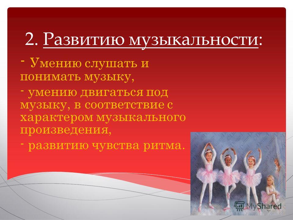 2. Развитию музыкальности: – Умению слушать и понимать музыку, – умению двигаться под музыку, в соответствие с характером музыкального произведения, – развитию чувства ритма.
