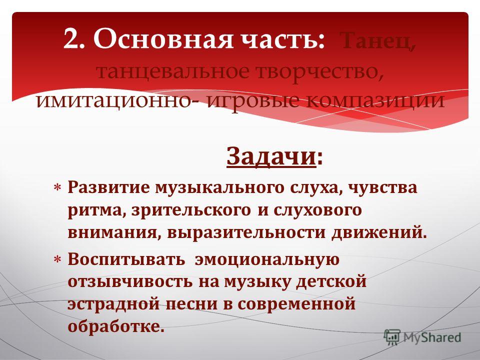 Задачи: Развитие музыкального слуха, чувства ритма, зрительского и слухового внимания, выразительности движений. Воспитывать эмоциональную отзывчивость на музыку детской эстрадной песни в современной обработке. 2. Основная часть: Танец, танцевальное творчество, имитационно- игровые компазиции
