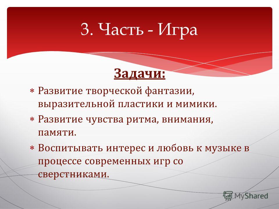 Задачи: Развитие творческой фантазии, выразительной пластики и мимики. Развитие чувства ритма, внимания, памяти. Воспитывать интерес и любовь к музыке в процессе современных игр со сверстниками. 3. Часть – Игра