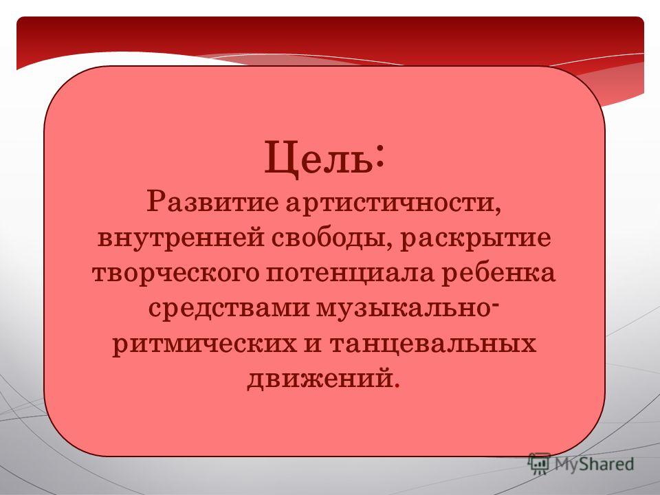 Цель: Развитие артистичности, внутренней свободы, раскрытие творческого потенциала ребенка средствами музыкально- ритмических и танцевальных движений.