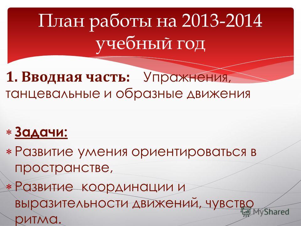 1. Вводная часть: Упражнения, танцевальные и образные движения Задачи: Развитие умения ориентироваться в пространстве, Развитие координации и выразительности движений, чувство ритма. План работы на учебный год