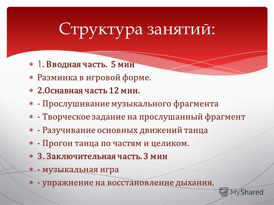 1. Вводная часть. 5 мин Разминка в игровой форме. 2.Оснавная часть 12 мин. – Прослушивание музыкального фрагмента – Творческое задание на прослушанный фрагмент – Разучивание основных движений танца – Прогон танца по частям и целиком. 3. Заключительная часть. 3 мин – музыкальная игра – упражнение на восстановление дыхания. Структура занятий: