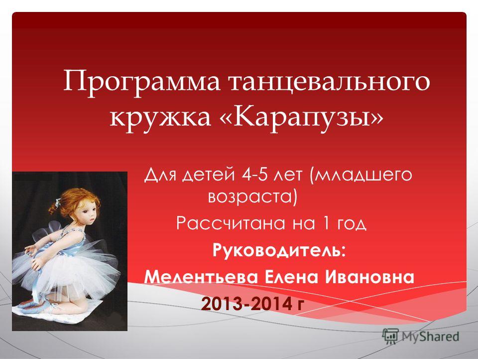 Презентация на тему: ” Программа танцевального кружка «Карапузы» Для детей 4-5 лет (младшего возраста) Рассчитана на 1 год Руководитель: Мелентьева Елена Ивановна 2013-2014 г.” — Транскрипт: