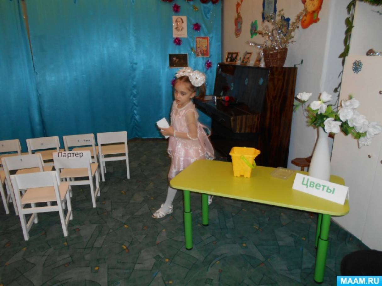 — А как вы думаете, чем мы можем занять свободное время до начала спектакля? (Пройти в кафе, попить чай, кофе, сок, съесть мороженое, пирожное и т. д., посидеть в фойе, посмотреть фотографии, программки).