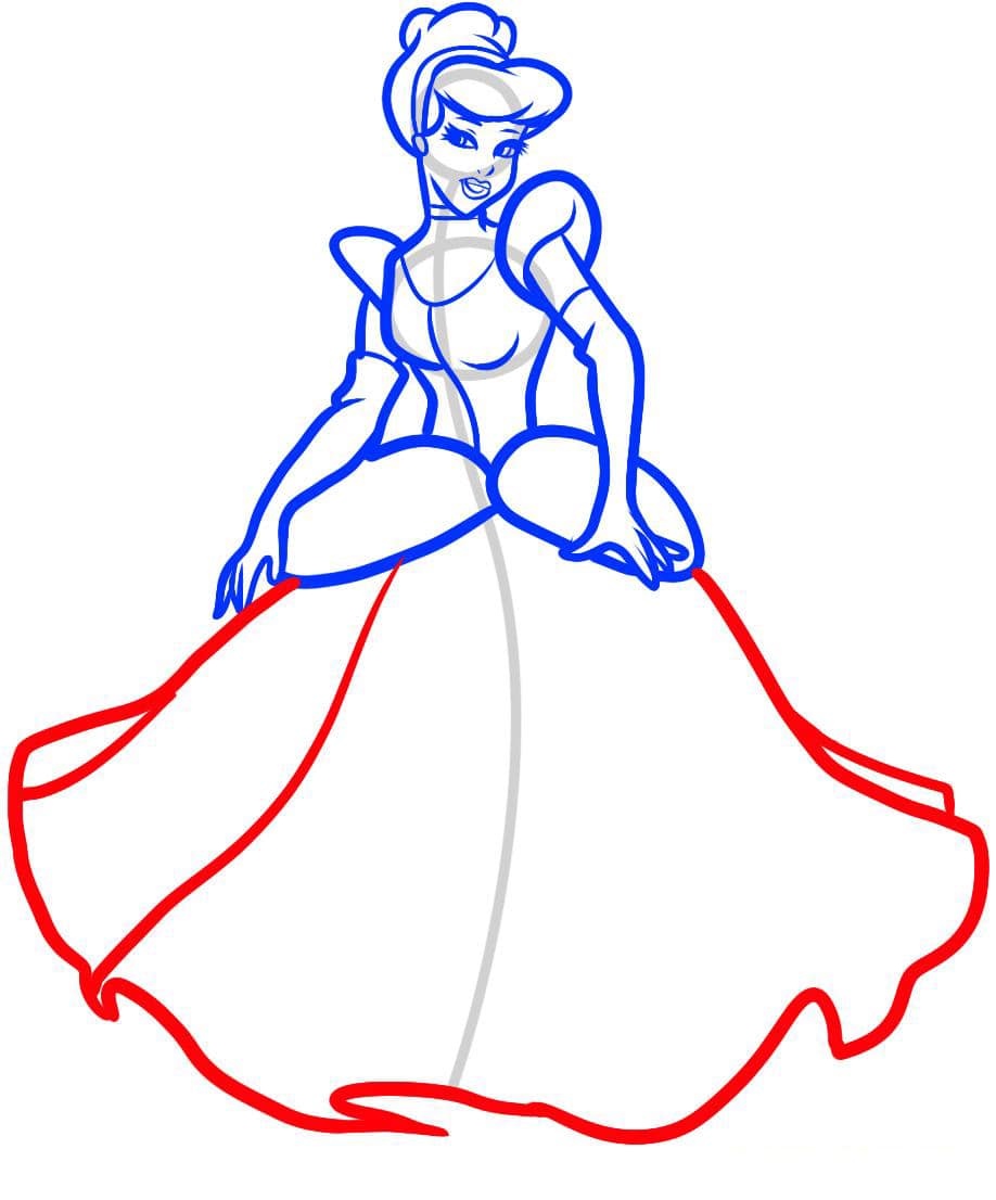 Затем очередь одежды. Придав форму верхней части — лифу, рукавам и перчаткам – можно приступать к низу. Завершающим этапом наброска станет проработка складок, оборок нижней юбки и туфелек. После чего готовое изображение можно заполнить цветом.
