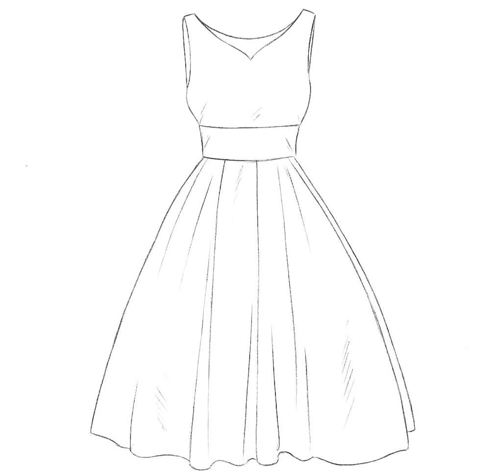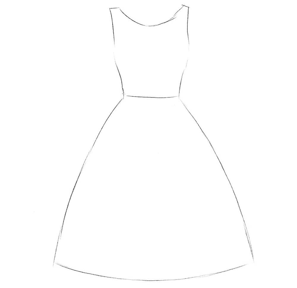 Давайте дадим законченный взгляд нашему рисунку платья. Используя четкие и красивые линии, обведите рисунок, стирая ненужные и лишние линии. Добавьте несколько складок и штриховок, как в нашем примере, это сделает рисунок более реалистичным.
