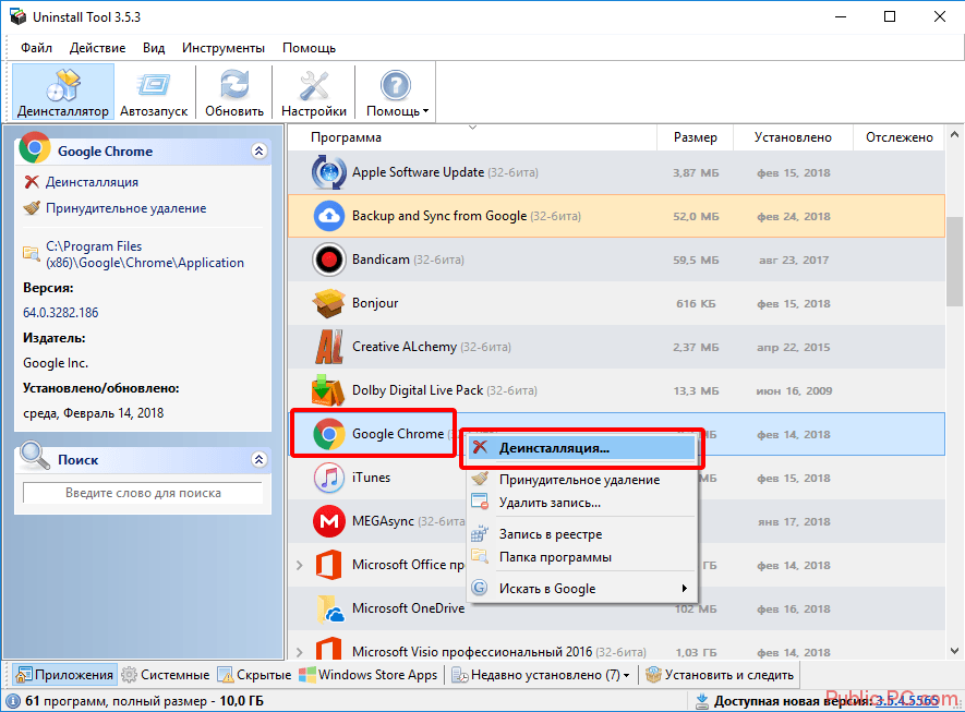 После того как мы скачали и установили программу, открываем её, перед нами откроется список из приложений, которые установлены на вашем компьютере. Выбираем браузер Google Chrome, нажимаем правой кнопкой и выбираем деинсталлировать.