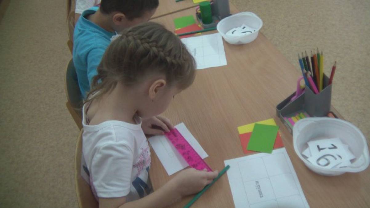 Воспитатель благодарит детей за правильное решение задач и приглашает пройти за столы, на которых лежат листы бумаги и наборы геометрических фигур.